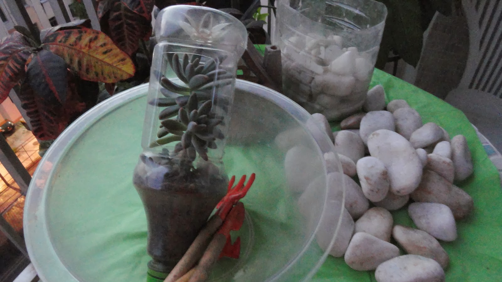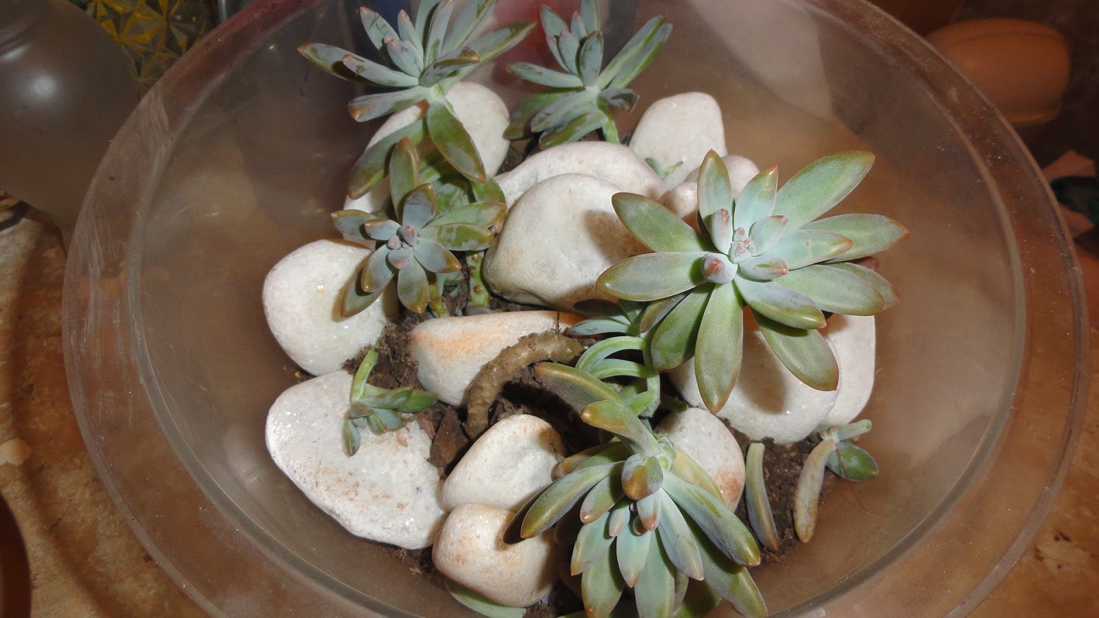 Certa vez, nas minhas caminhadas pedi uma mudinha de suculenta para o jardineiro de um restaurante , onde sempre paro para tirar algumas fotos. De lá pra cá, tenho tentado com que ela sobreviva. Primeiramente coloquei em garrafas que reciclei - AQUI - depois , como elas cresceram , replantei reaproveitando uma tigela plástica - AQUI - Tudo tentando com que ela ficasse bonita e redondinha como vejo nos blogues das amigas. Tenho buscado orientação com a Simone - Eu e Minas Plantinhas e ela gentilmente tem me ajudado.
